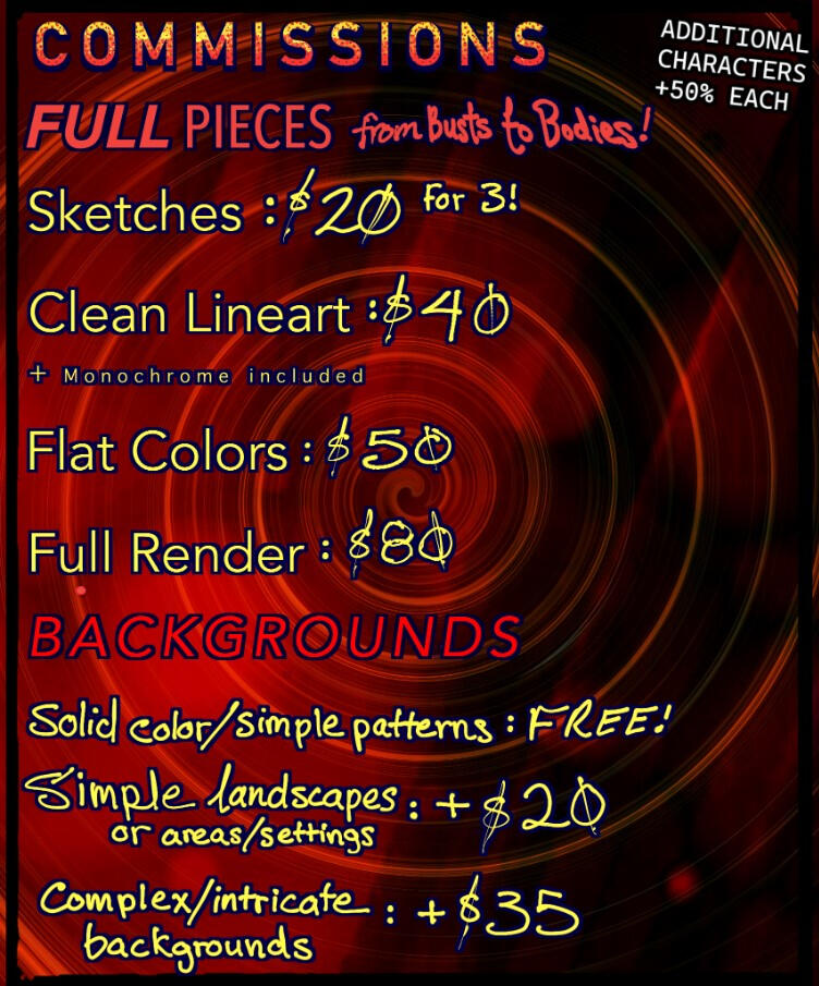 I hold the right to deny any commissions that I am not comfortable doing. Refunds can be provided if I am unable to complete a commission due to unforeseen circumstances. However, once a commission has been started, I will not provide refunds.